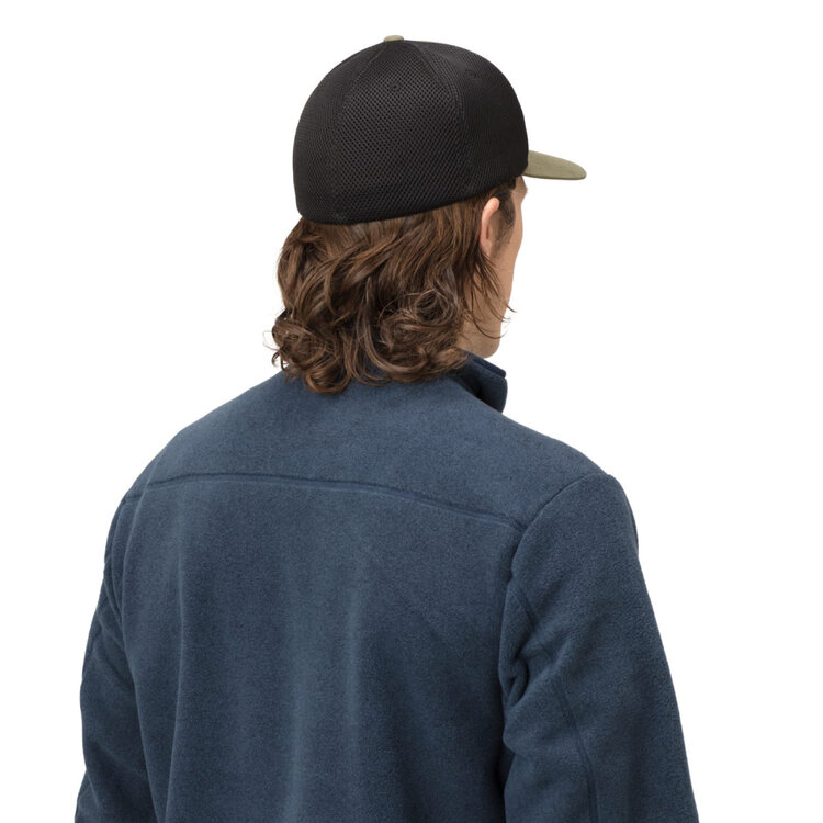 This cap’s main fabric is 100% organic Cotton. The back half of the cap is made with a Polyester/Elastane mesh construction.