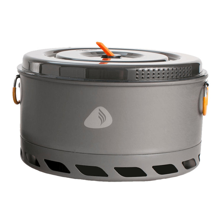 Quickly and efficiently boil water or simmer up some chili for larger groups with the 5-liter FluxRing pot. Jetboil's FluxRing technology features a hard-anodized aluminum construction that delivers extremely efficient boiling times despite the large capacity. Use the 5-liter pot to cook larger basecamp meals, such as rice dishes, pastas, or even a pot roast. Easily move the pot from the cook stove to the table without burning your hands with the insulated handles. The FluxRing pot is optimized for use with the Jetboil Genesis and HalfGen cook stoves, which nest snugly within the pot. Includes strainer lid and protective skirt; measures 10 inches in diameter by 6 inches tall; weighs 32.9 ounces.