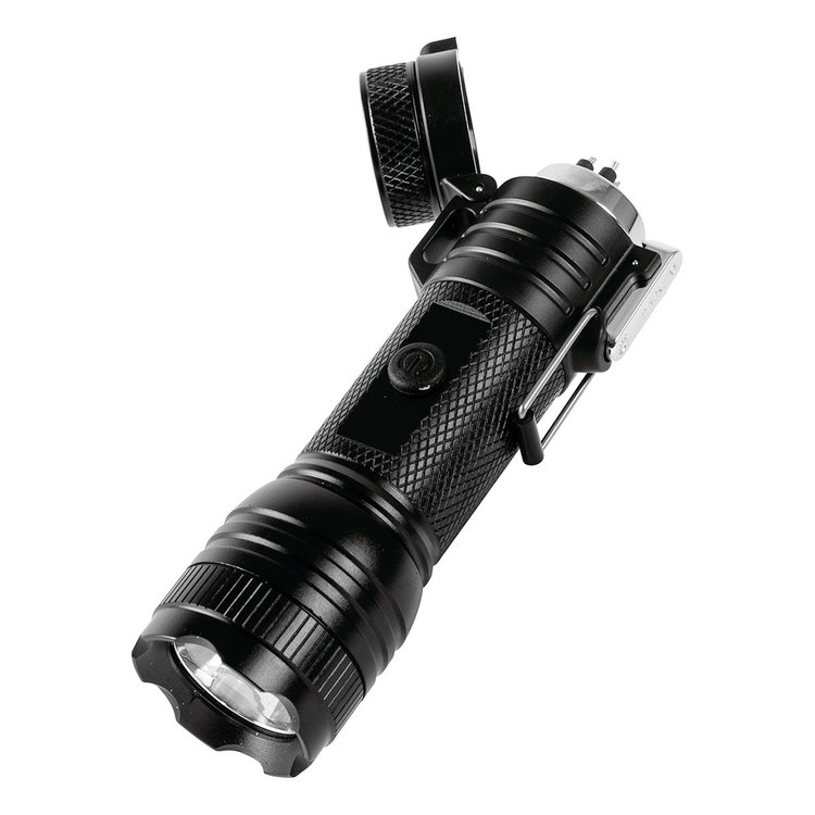At first glance, it’s a cool, rechargeable LED flashlight that pumps out some serious light. Flip open the locking, spring-loaded bezel, and you’ll find a dual-arc plasma lighter tucked inside.