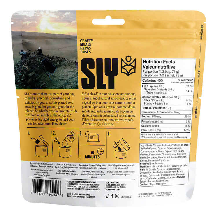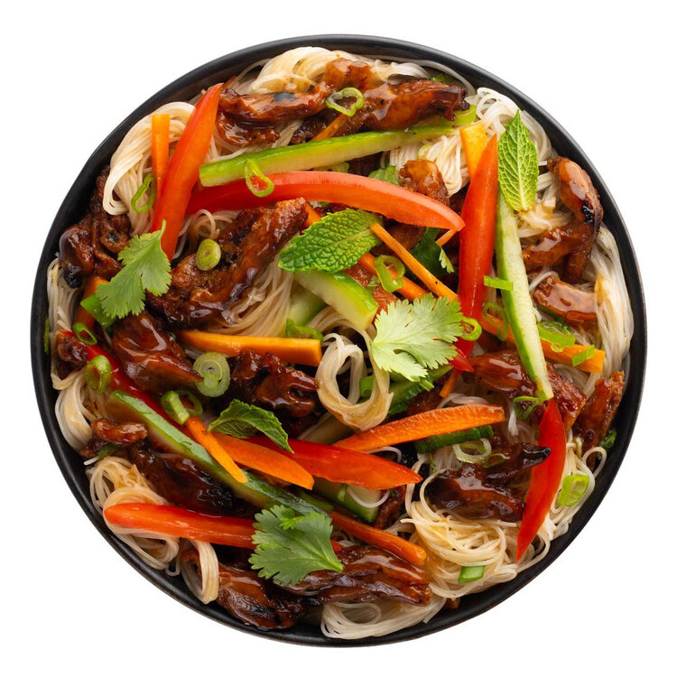 Rice Vermicelli, Pea Protein, Canola Oil, Carrot, Red Bell Pepper, Cucumber, Peanuts, Green Onion, Soy Sauce, Brown Sugar, Mushrooms, Rice Vinegar, Coriander, Mint, Garlic, Natural Flavour, Spices, Xanthan Gum.