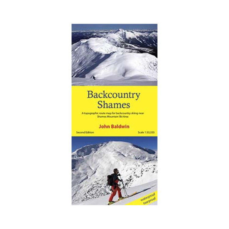 Backcountry Shames describes backcountry skiing near Shames Mountain ski area in northwestern British Columbia. Routes are marked on a 1:33,300 scale topographic map and include information on ski ascent routes, ski runs, popular names, backcountry cabins, driving distances and parking areas.