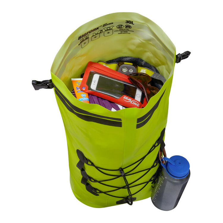 Introducing the Bigfork™ — A highly durable dry daypack built for paddlers. This 30L waterproof pack with welded seams is designed to comfortably carry gear and protect essentials on single day and overnight adventures. Features include a reliable DrySeal™ roll-top closure, removable padded shoulder straps and webbing waist belt, an exterior bungee storage system for quick stowing and retrieval, a light-coloured interior for easily identifying contents within, and lash points for securing and attaching accessories.