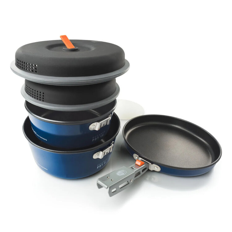 The pot and lid combo are perfect for stovetop use. Every set includes a 2 pots, a frypan, 2 nylon strainer lids, a dished cutting board for a variety of prep duties, a folding pot handle, and a welded stuff sack to keep everything organized and doubles as a sink for washing. Features a crush-proof, heat-resistant strainer lid.