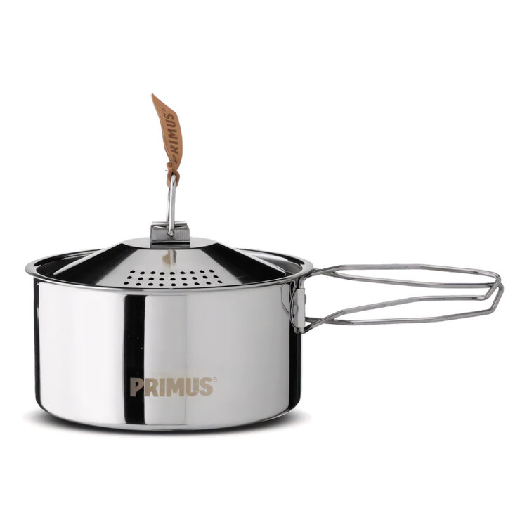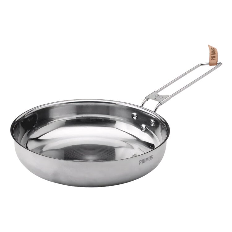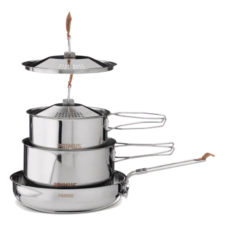 All pots and pans are made from 18/8 stainless steel and offer folding handles that make cooking, cleaning and then packing-up and storing a breeze. The lids to both pots have an integrated colander and a leather tab that allows lid removal without the fuss of a hot pad.