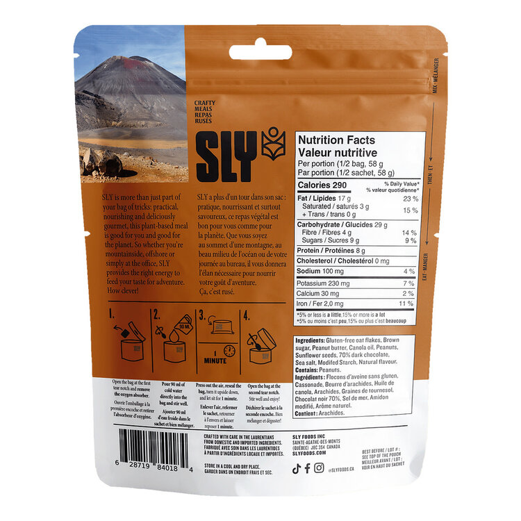 Gluten-free oat flakes, Brown sugar, Peanut butter, Canola oil, Peanuts, Sunflower seeds, 70% dark chocolate, Sea salt, Modifed Starch, Natural flavour.