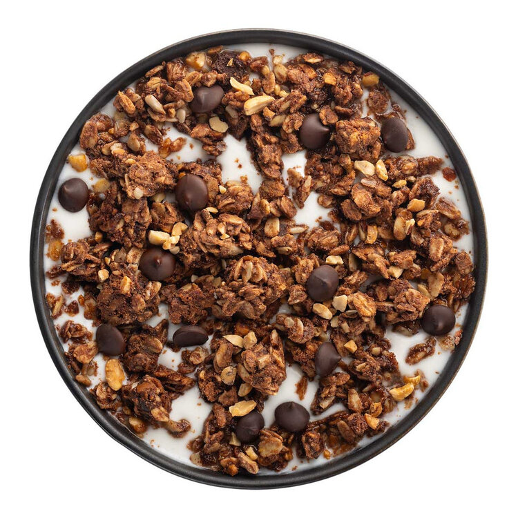 Choco-crunch power. Oat granola, sunflower seeds, and chocolate with peanuts in a plant-based oat milk.
