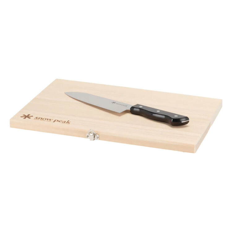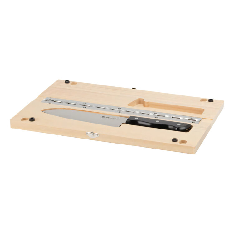 The Cutting Board Set L is a foldable wood cutting board and stainless steel knife. Designed with the outdoor cook in mind, the Cutting Board Set L is ideal for prepping larger meals. The cutting board can be unfolded to safely store the full-sized chef knife. The Cutting Board Set L integrates into the Iron Grill Table system for added functionality.