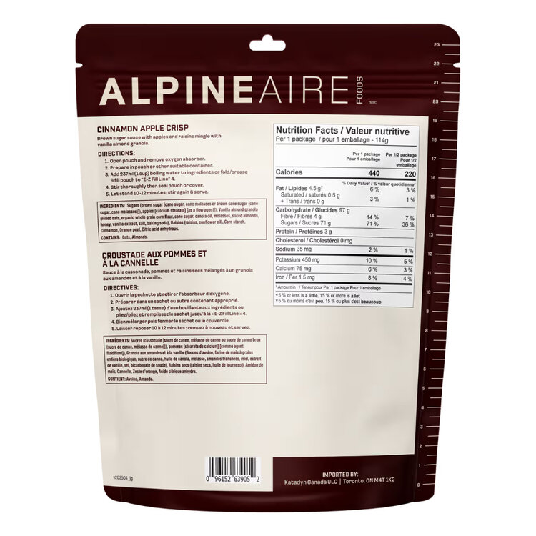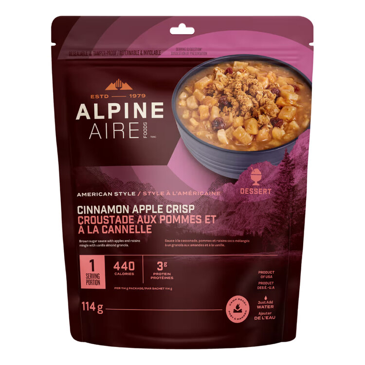 Bring home-baked favourites on your backcountry camping adventure. Add boiling water for warm spoonfuls of apples, cinnamon, raisins and brown sugar. Comes with crunchy French vanilla almond granola to sprinkle on top.
