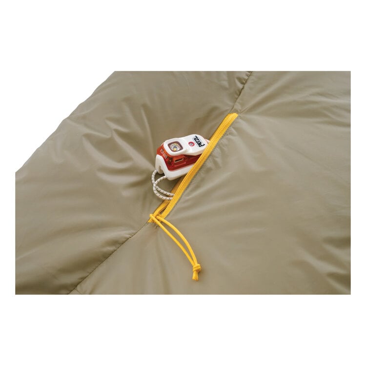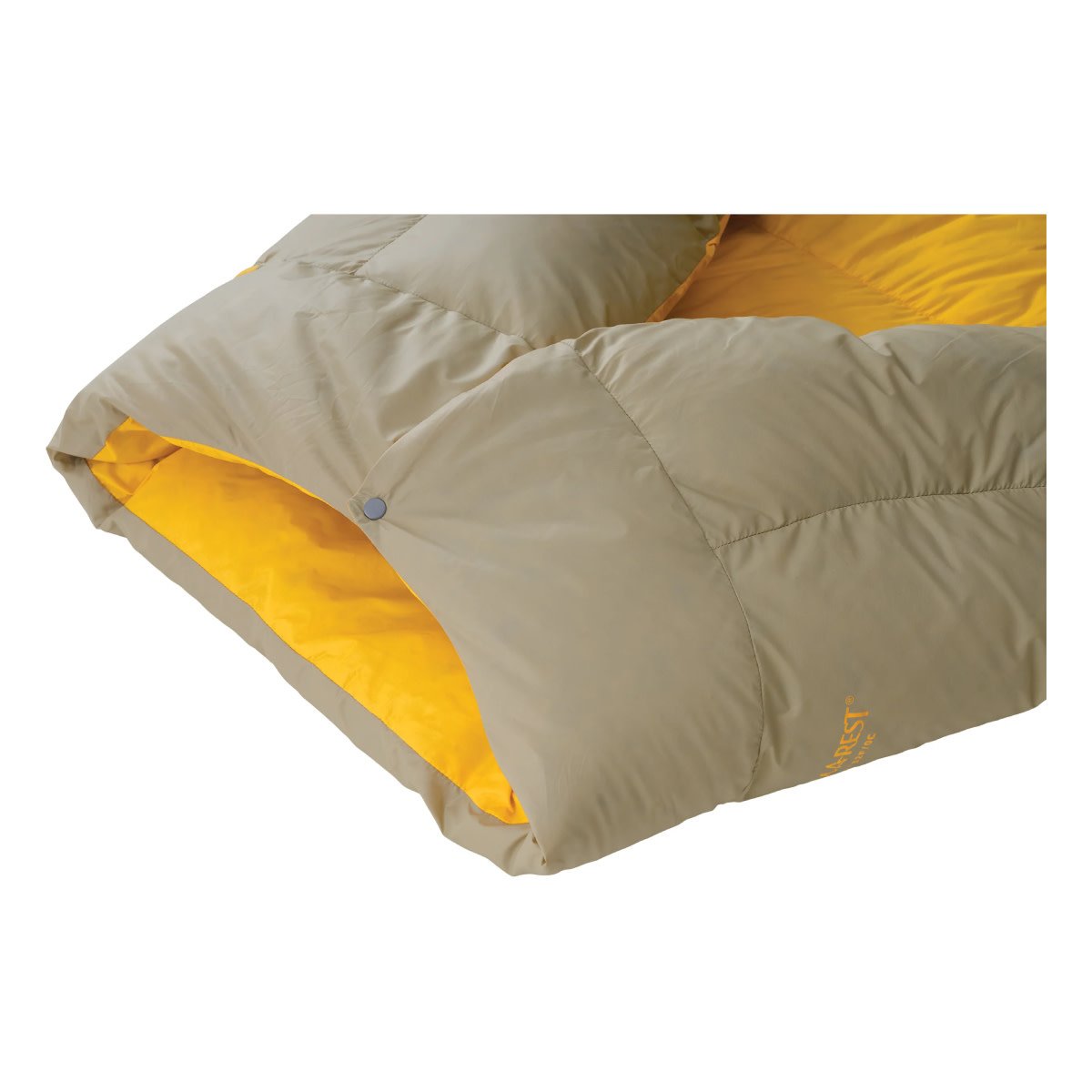 Blending lightweight comfort, functionality and just the right amount of warmth, the Corus quilt is ideal for warmer three-season backcountry adventures or as part of a layering system in colder conditions. Made with packable hydrophobic down and box baffled construction for excellent temperature regulation, the Corus offers a surprisingly liberating feeling of unrestricted movement throughout the night, just like your comforter at home. The footbox is designed to either slip over your pad to eliminate drafts or over your feet for extra warmth. A snap closure at the neck keeps the quilt in place on colder nights.
