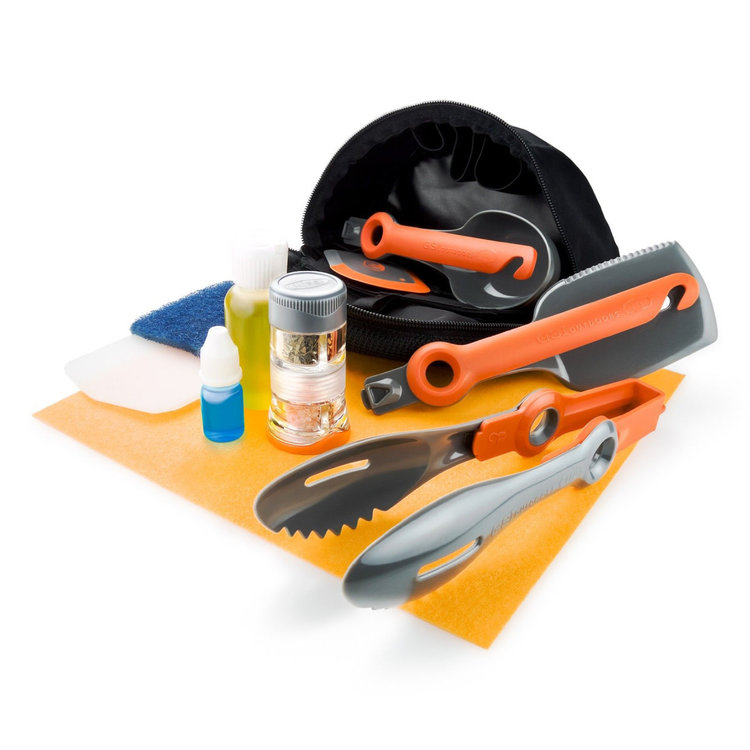 - Includes: Compact Scraper, Scrubby Pad, Cutting Board, Pivot Tongs, Pivot Spoon, Pivot Spatula, Spicer, Soap Bottle, Oil Bottle, Camp Towel, Tote