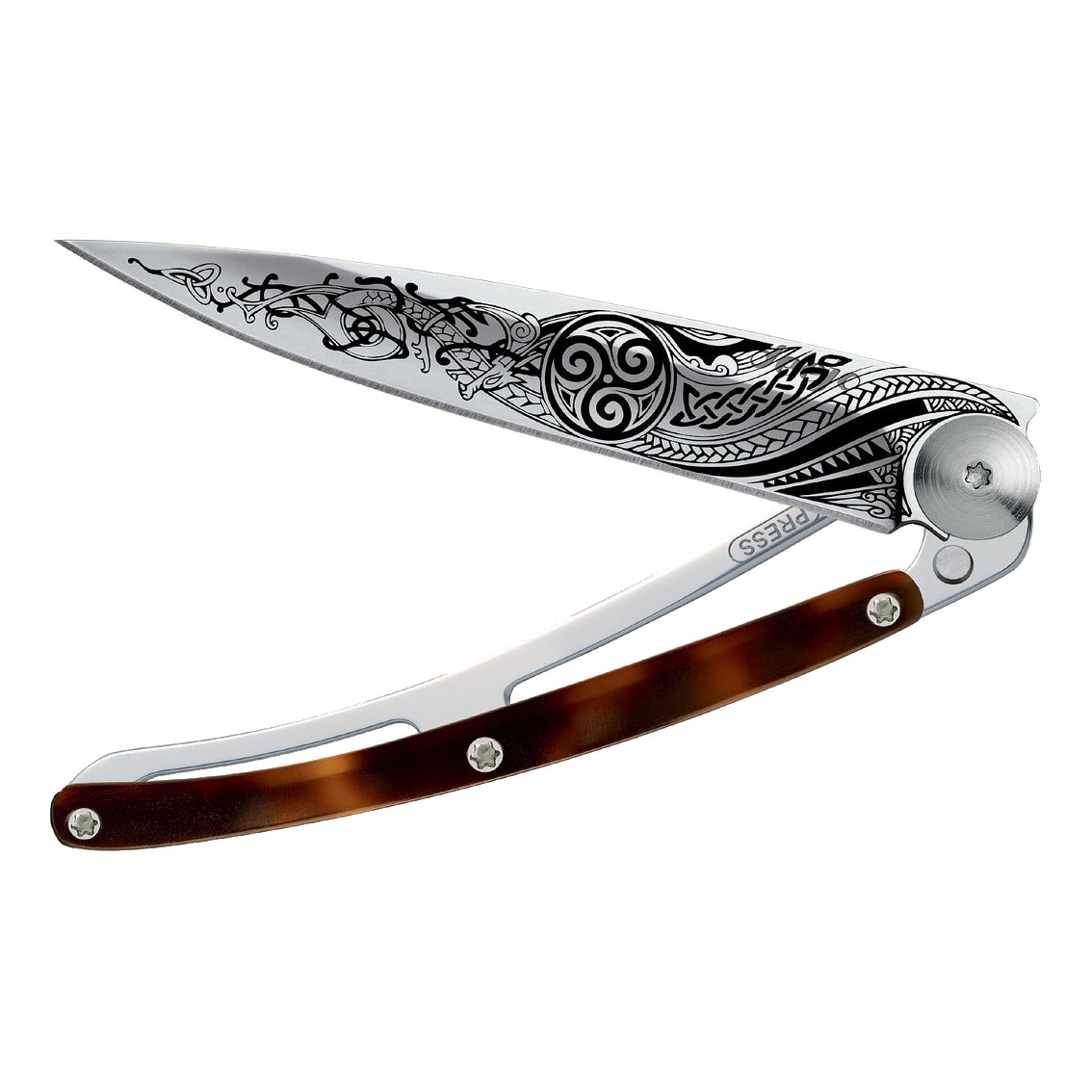 The elegance of this traditional Celtic tattoo is enhanced by its handle in amber tortoiseshell. A unique piece, symbolizing heritage and elegance.