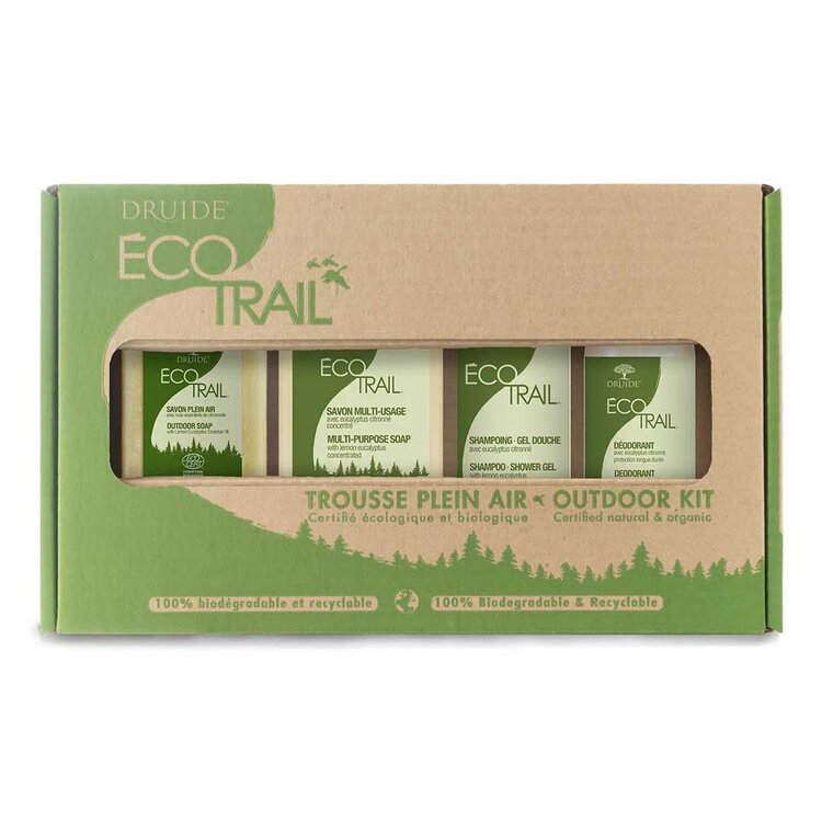 For all hikers and camping enthusiasts, the Ecotrail Outdoor Essentials Kit is made for you! With its ecological formulas, Druide offers you products that respect the environment and ensure perfectly adapted hygiene. The kit includes 4 lemon eucalyptus-based hygiene products.