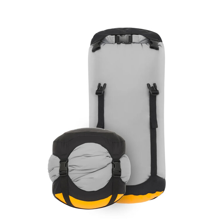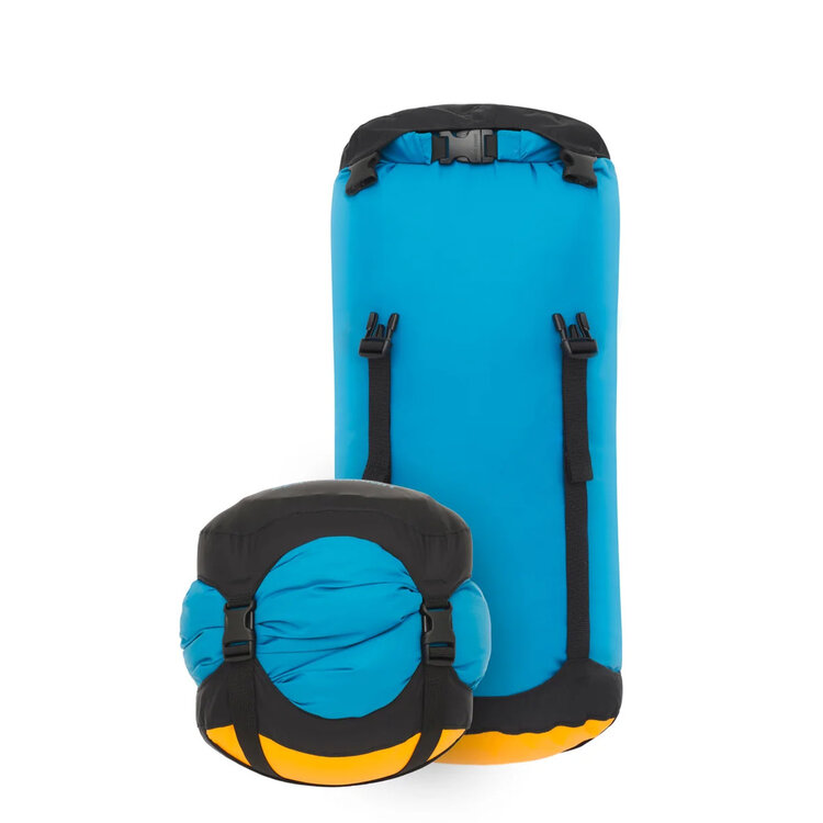 Perfect dry compression storage for everything from bikepacking to sea kayaking and beyond. Made from a bluesign-approved recycled 70D nylon waterproof main body fabric and a 70D eVac® waterproof but air-permeable base that allows you to push air out while still keeping your contents dry inside. This means there's no need for purge valve, making the Evac Compression Dry Bags light and simple. Four compression straps make it easy to evenly compress soft items, while the hypalon non-wicking roll-top closure also keeps the water out. DWR finishes on both fabrics are C0 non-PFC. Simple, rugged and reliable the epitome of durability, versatility, and dry compression.