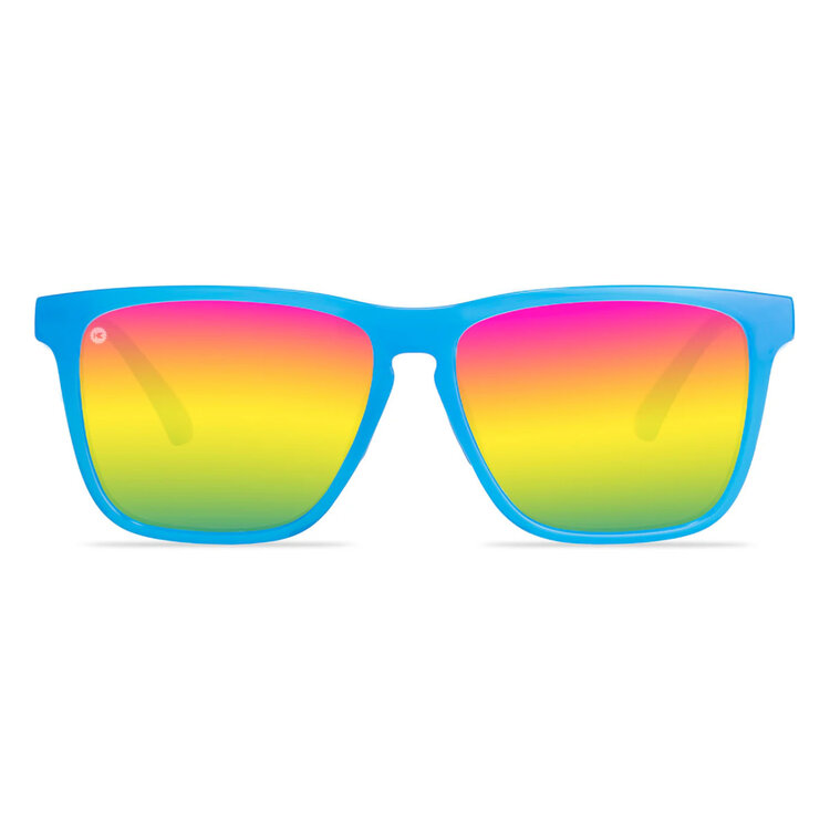 Built for sunny skies and fun filled adventures, Knockaround's Rainbow Blues Fast Lanes Sport sunglasses never fail to lighten the mood. Jelly blue frames surround vibrant rainbow lenses for a bright and cheery vibe all around. Grippy nose pads come in handy for any mid-air moments, while polarized UV400 protection and impact resistance keep your peepers safe day to day. Staying cool is mandatory, keeping your feet on the ground is optional.