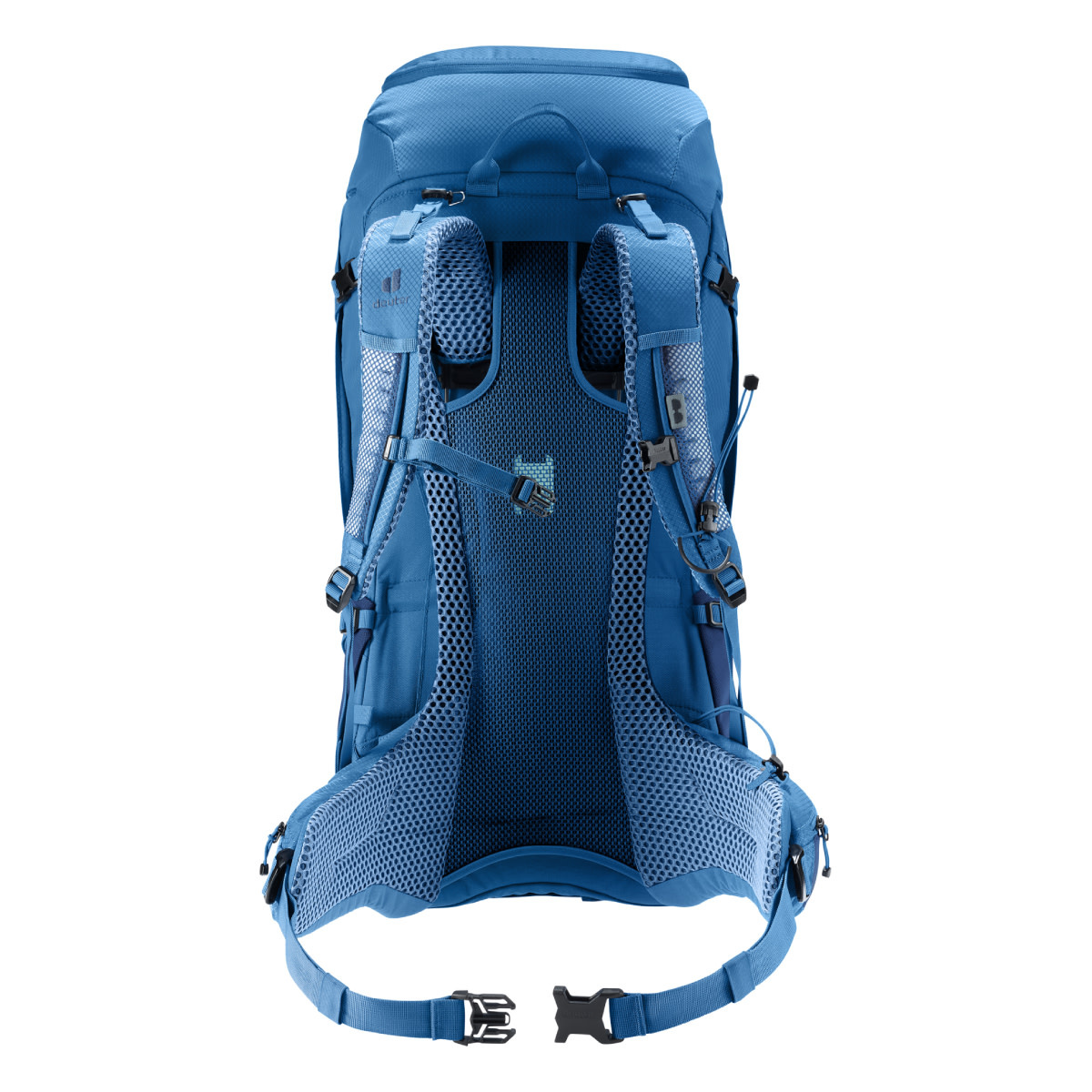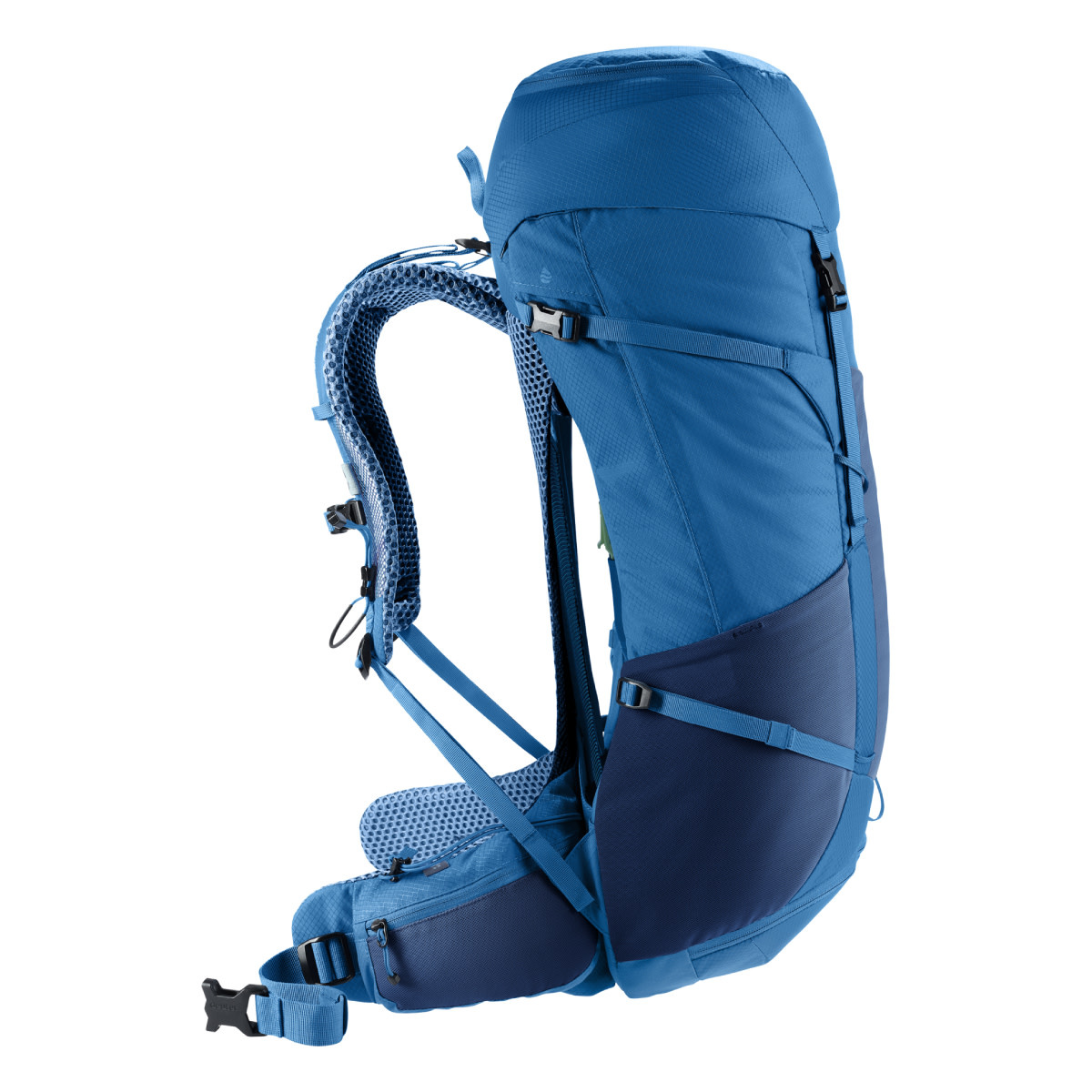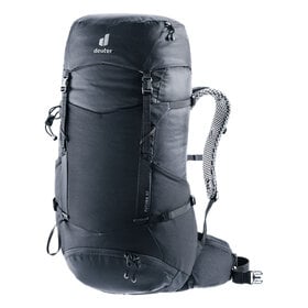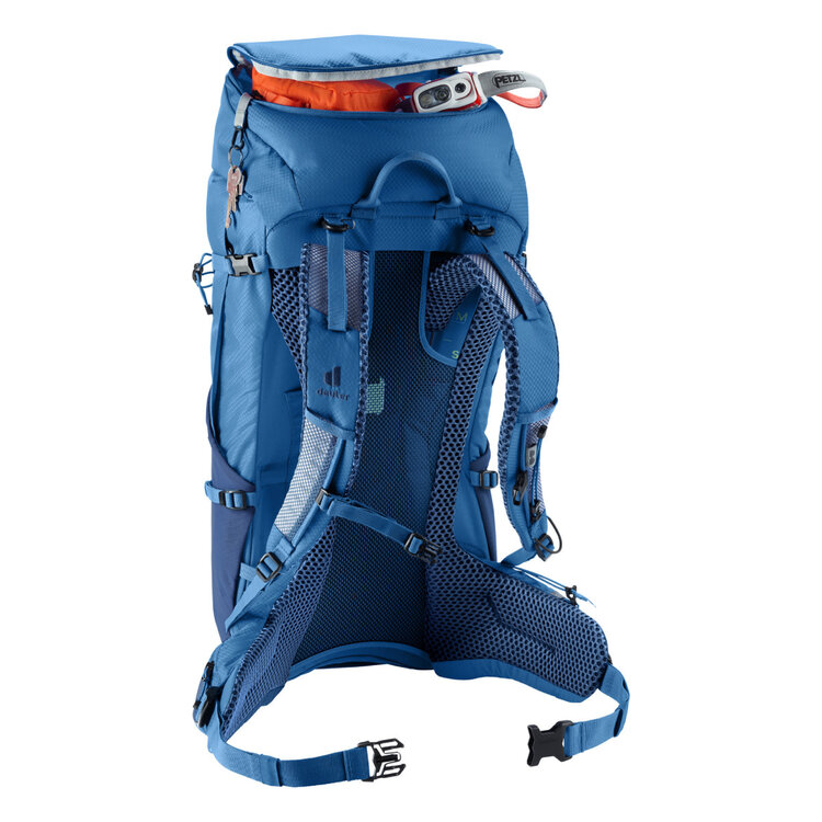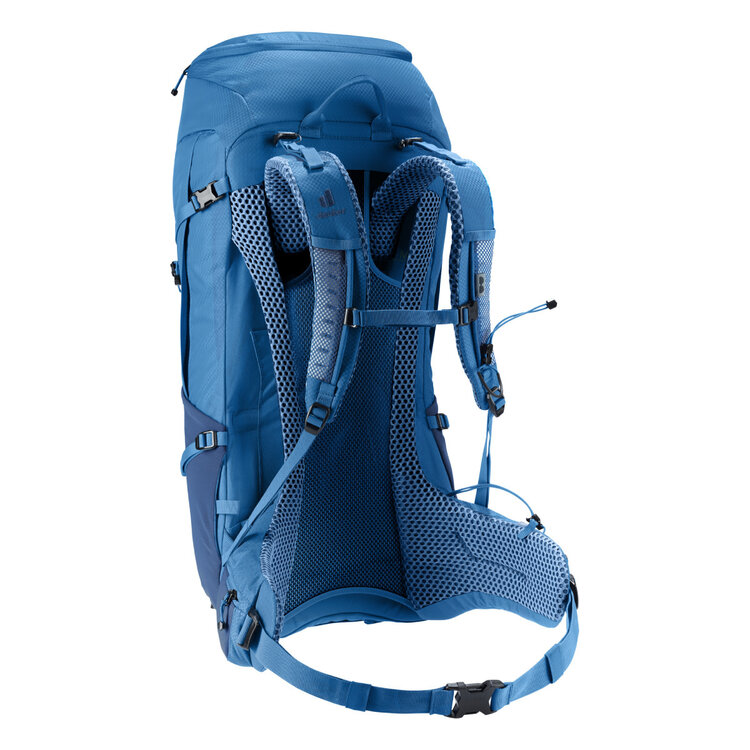 This hiking backpack for extended hikes comes with Deuter's Aircomfort back system featuring their innovative VariClick 5-stage adjustable back length. Shoulder straps anchored directly to the frame deliver improved load transfer, while the padded hip fins distribute the weight evenly. Soft mesh extends down the full length of the back for maximum ventilation performance and a wrapping fit.