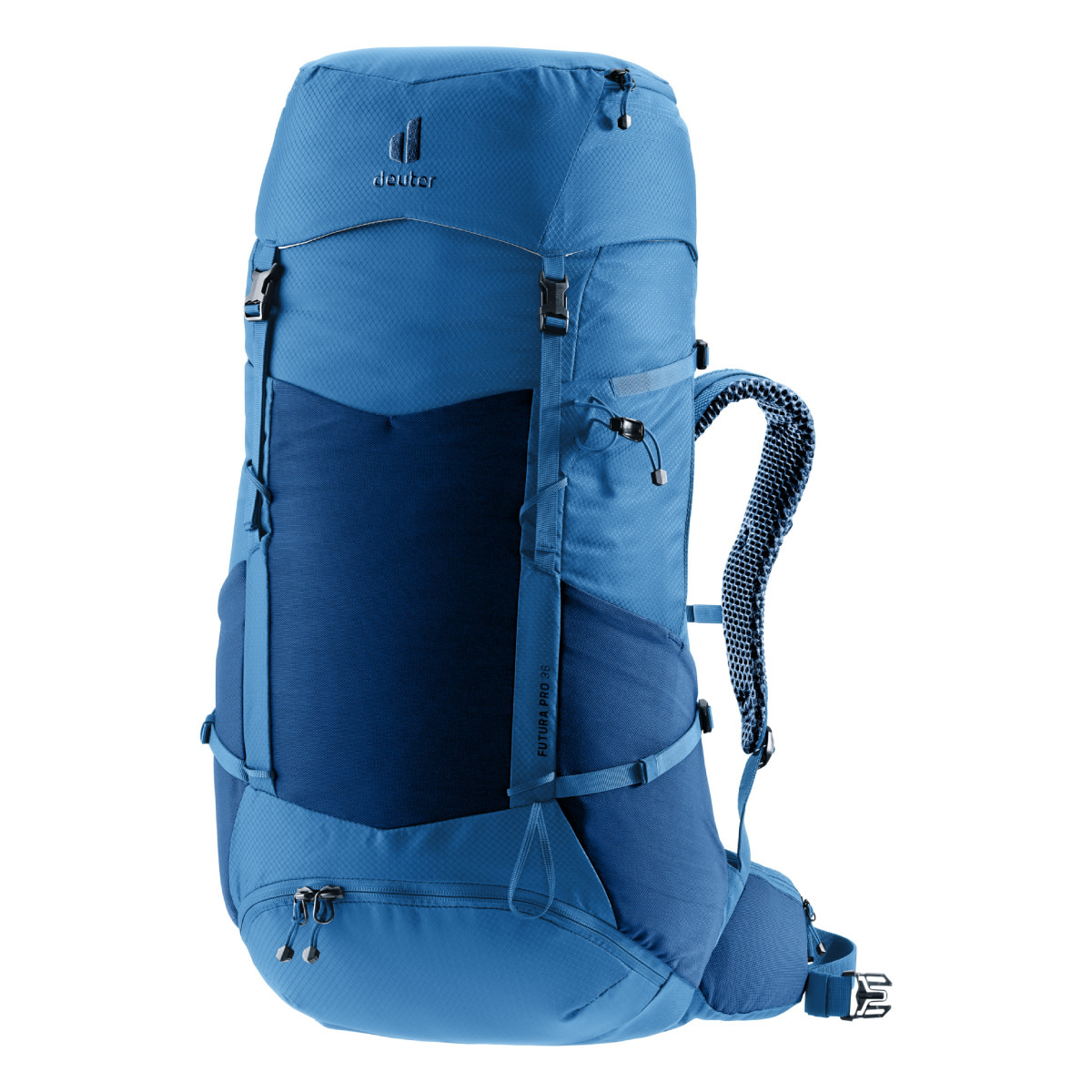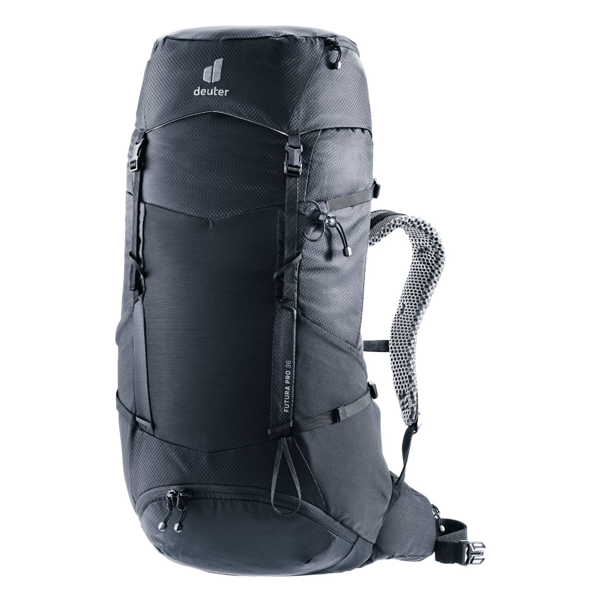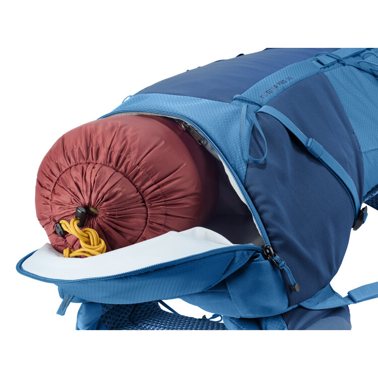 This hiking backpack for extended hikes comes with Deuter's Aircomfort back system featuring their innovative VariClick 5-stage adjustable back length. Shoulder straps anchored directly to the frame deliver improved load transfer, while the padded hip fins distribute the weight evenly. Soft mesh extends down the full length of the back for maximum ventilation performance and a wrapping fit.