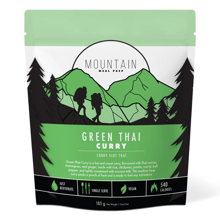 Fuel up with Mountain Meal Prep's Green Thai Curry, a delicious and aromatic meal featuring a balance of hot and sweet flavours. This curry is crafted with Thai spices, lemongrass, ginger, and lightly sweetened coconut milk, combined with rice, chickpeas, potatoes, and veggies. Packed full of flavour, and ready to fuel any adventure.
