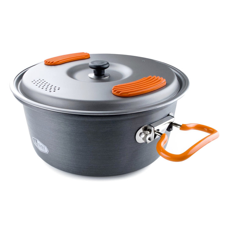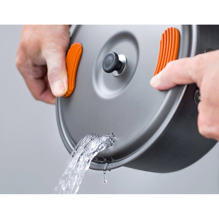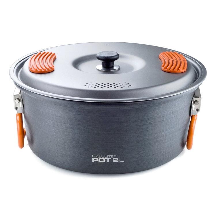 Halulite hard anodized aluminum provides superior conductivity to titanium while still being incredibly light meaning that this 2 liter pot cooks more efficiently so you can go farther and carry less fuel. The integrated silicone thumb pads on lid make straining pasta safe and secure.