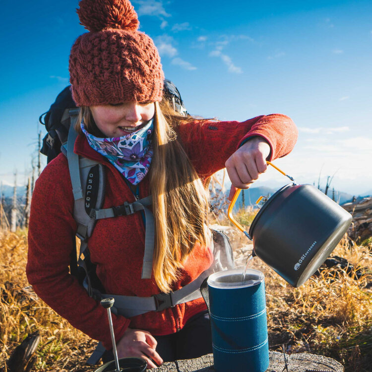 Insulating silicone pot gripper attaches magnetically to fuel canister while cooking so it's always at hand. Unique 1 L pot and lid boil water for pouch meals before transforming into an insulated mug by inverting the lid and slipping the pot into its sleeve.