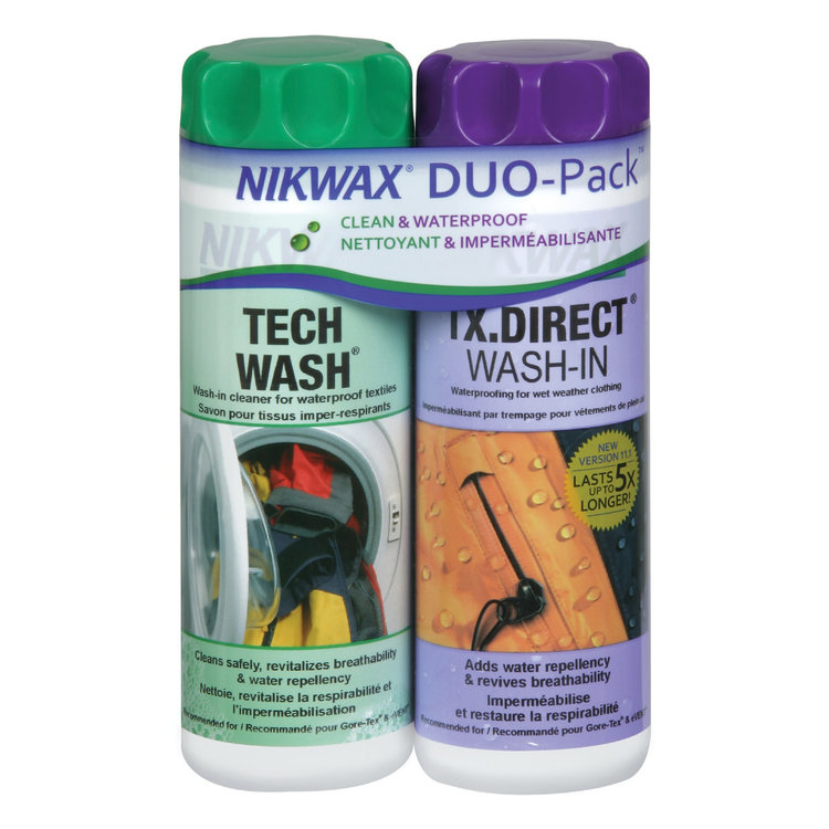 Clean and waterproof your wet weather clothing with Nikwax's convenient Duo-Pack.