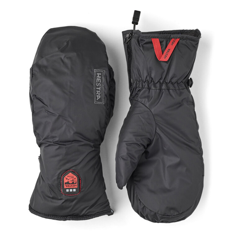 Hestra’s heated liner acts as an extra warm lining for ordinary mittens for skiers and others who are prone to cold hands. Heating elements in fingers and backhand keep hands comfortably warm even on the coldest winter days. The temperature is adjusted by pressing the Hestra logo on the backhand of the liner. The Heated Liner is designed to fit Hestra’s Army Leather Heli Ski Mitt but also works in a number of Hestra’s other mittens with a high cuff and a detachable liner. The outer flexible ripstop fabric slides easily inside a shell glove while the fleece with synthetic insulation inside provides comfortable core heat. Also available in a five-finger version.