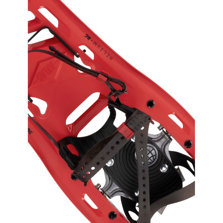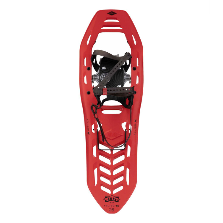 Ultra-light backcountry performance. That’s what you demand, and that’s what the Atlas Helium-BC delivers. With the 23” model coming in under 3lbs per pair the Helium-BC is almost as light as the name implies. The composite Helium deck provides the feather-light foundation and features a unique louver design to shed snow more efficiently. The low-profile, tempered steel BC crampon sits lower in the frame to compliment the PackFlat™ binding and allow for a more natural rotation feel with every step. A backcountry necessity, this binding features urethane Z-straps that hold the foot securely and are field-serviceable with the included BC utility strap. As the name implies, it’s designed to pack down flat when not in use for easy and efficient packing or lashing. Adding to the grip of the BC crampon, anodized aluminum traction rails provide a secure grip when ascending, descending and traversing. When weight and space are limited, but reliability and performance can’t be, you need the Helium-BC.