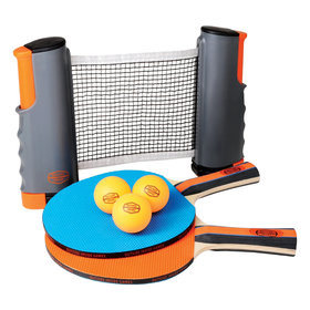 Now you can play ping pong anywhere! This freestyle table tennis set features extendable net, full size table tennis paddles, 3 ping pong balls and carry bag. Makes any table into a game zone! A great way to inject a little friendly competition into your