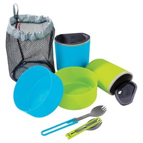 This versatile mess kit combines the bowls and mugs from our popular Trail Lite Duo Cook Set with two color-matched folding utensils. The whole kit is conveniently packaged in a breathable mesh storage bag. Includes 2 Insulated Mugs, 2 Deep Dish Bowls, 2