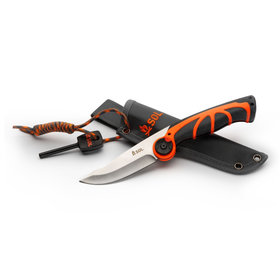 The SOL Stoke Field Knife is three tools in one. The high-grade, satin-finished 420 stainless steel 3.9-inch full-tang blade is serrated at the base to use as a rope cutter. Strike the blade on the full flint fire starter to light a piece of the tinder co