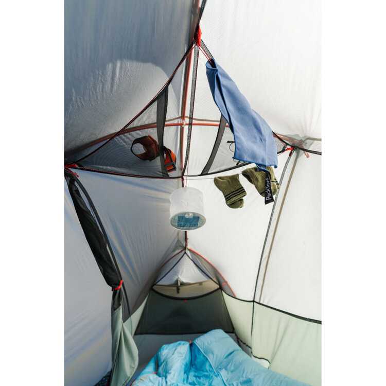 The Inside: The interior is a roomy 20 sq. feet with no taper to accommodate a modern rectangular sleeping pad. The tent body is solution-dyed micromesh for exceptional breathability and bug protection, perfect for star-gazing on clear nights. The no-curve tent door features zippers that are easy to use with one hand. They also zip closed to a single point so you always know where to open the door, even in the dark. Tech-friendly pockets feature cable ports at the corners for headphones and charging cords. A large overhead gear loft pocket is perfect for a headlamp, sunglasses and other quick-access items, and an included clothesline lets you dry out damp clothes.