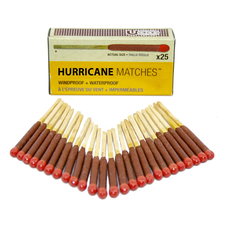 - Hurricane Matches = Windproof & Waterproof = 15 Second Burn Time