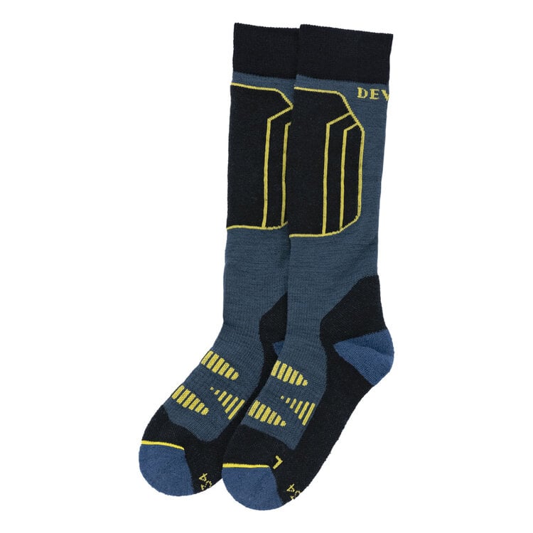 Devold Alpine Ski Socks for Kids are tailored to fit inside ski boots. The Alpine ski sock is insulating and temperature-regulating, keeping your feet dry and warm. It is elastic for a perfect fit and minimizes the risk of blisters, while also being high on the calf to prevent chafing against the boot.