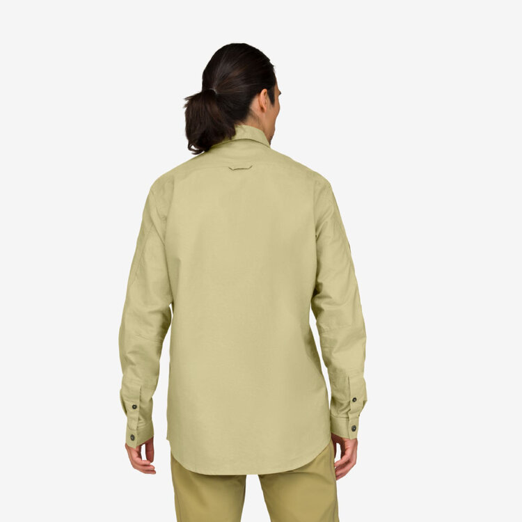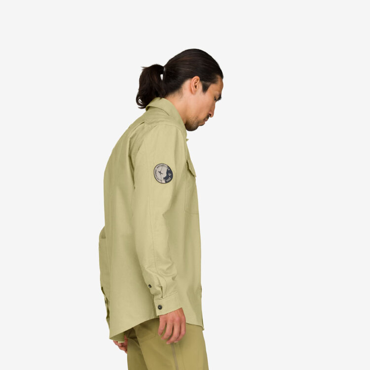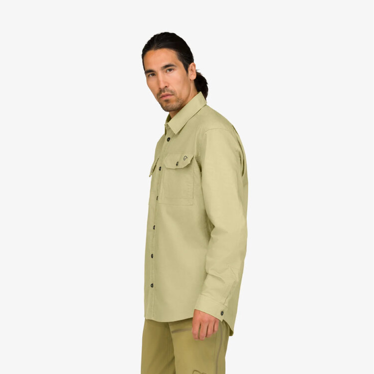 Main features include: Three pockets – two with buttons. On the left side you find a vertical zip pocket. The arms are bent in advance for increased movement. Three-needle-seams in exposed places on the shirt – typical for durable workwear. Two small holes under the arms to increase ventilation. A hang-loop to easily hang the product to dry. And a patch with storytelling from the great Ulvetanna 2007 climbing expedition.