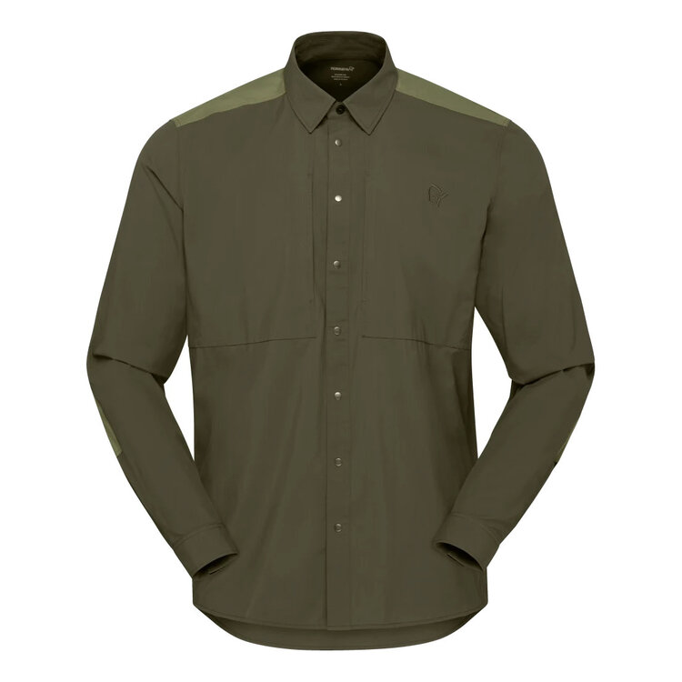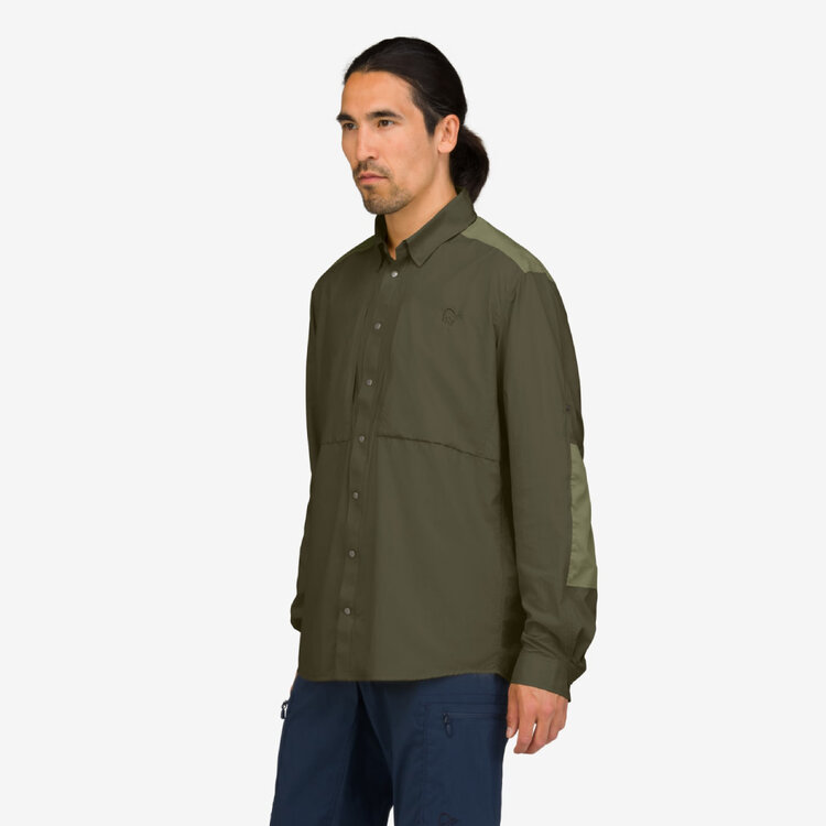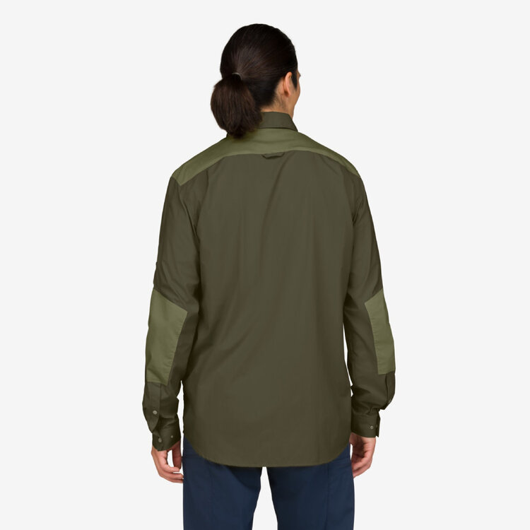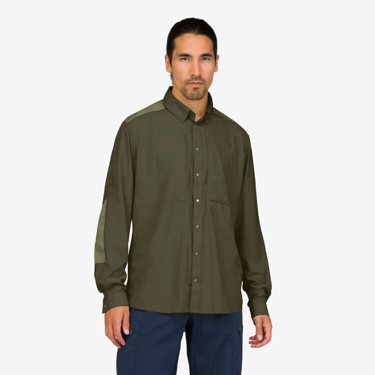Key features include: A sun protective collar, foldable sleeves with stay-in-place attachments and chest pockets.
