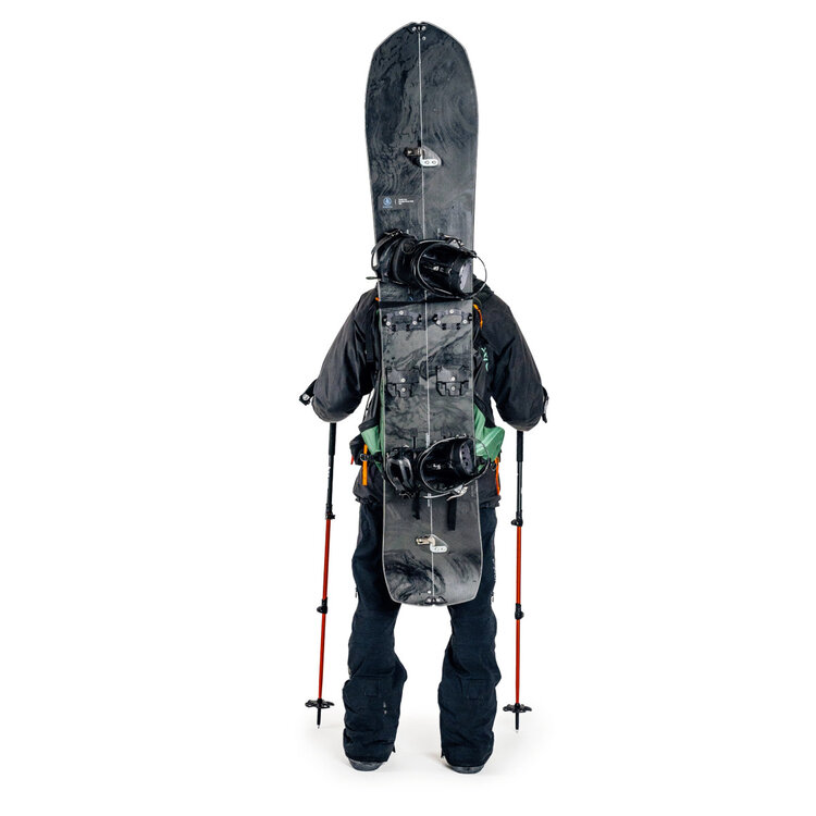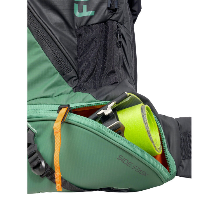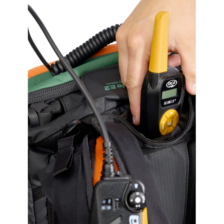 BCA’s new Float E2 avalanche airbag packs use an Alpride E2 supercapacitor system to store energy that powers the compressor upon deployment. Supercapacitors store and release energy based on electromechanical properties rather than a chemical reaction like in rechargeable batteries. This makes supercapacitor performance much more reliable in cold temperatures. For the same reason, the energy stored in a supercapacitor releases faster when activated for deployment. The new E2 engine is 40 percent smaller and 25 percent lighter than the existing Alpride E1 system, with a 162-liter airbag. Like the E1, the E2 is TSA-approved for hassle-free airline travel. While the E2 system makes it easy to travel by air, their innovative Side Stash pocket and Back Stash zip make it easier to travel on snow —without stopping to hydrate, swap hat/gloves/eyewear, or even skins— just rip ‘em, stash ‘em and go!