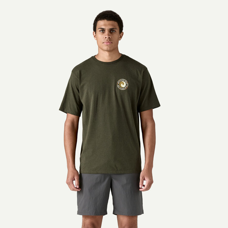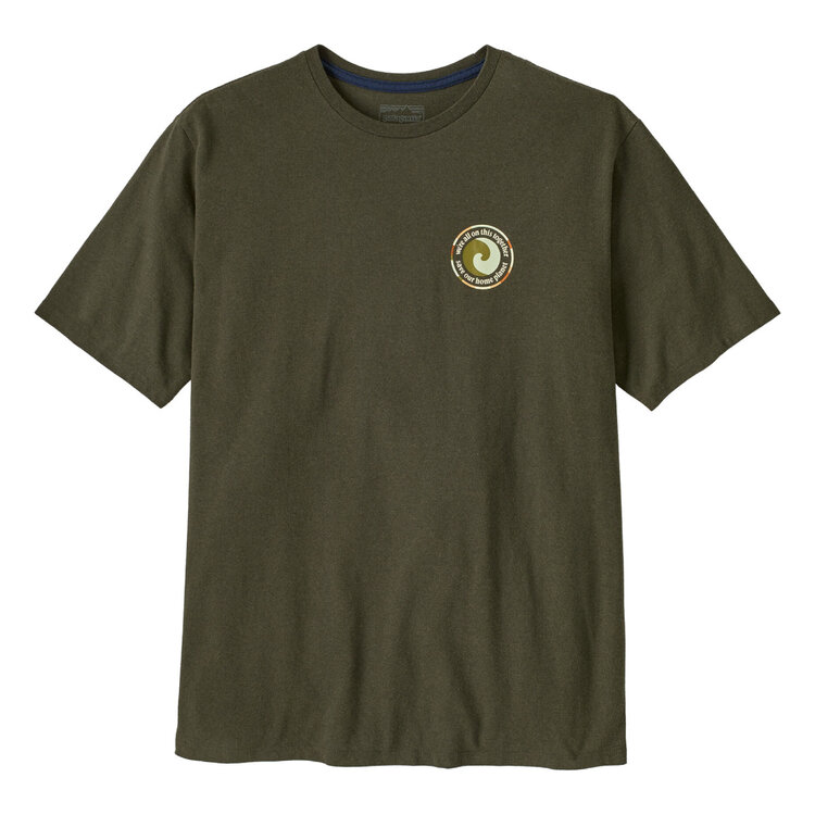 The artwork for Patagonia's Unity Fitz styles has a stylized Earth and the message "we're all on this together," plus the gist of their purpose statement "save our home planet." It's printed on a T-shirt made with 100% recycled fabric that reduces our reliance on virgin raw materials. Made in a Fair Trade Certified™ factory.