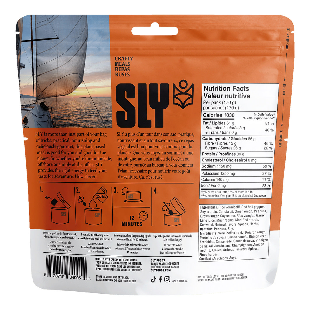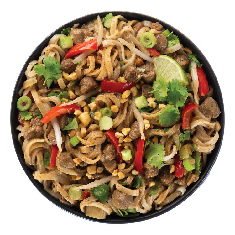 Rice vermicelli, Red bell pepper, Soy protein, Canola oil, Green onion, Peanuts, Brown sugar, Soy sauce, Rice vinegar, Garlic, Lime juice, Mushrooms, Modified starch, Seaweed, Natural flavor, Spices, Herbs.
