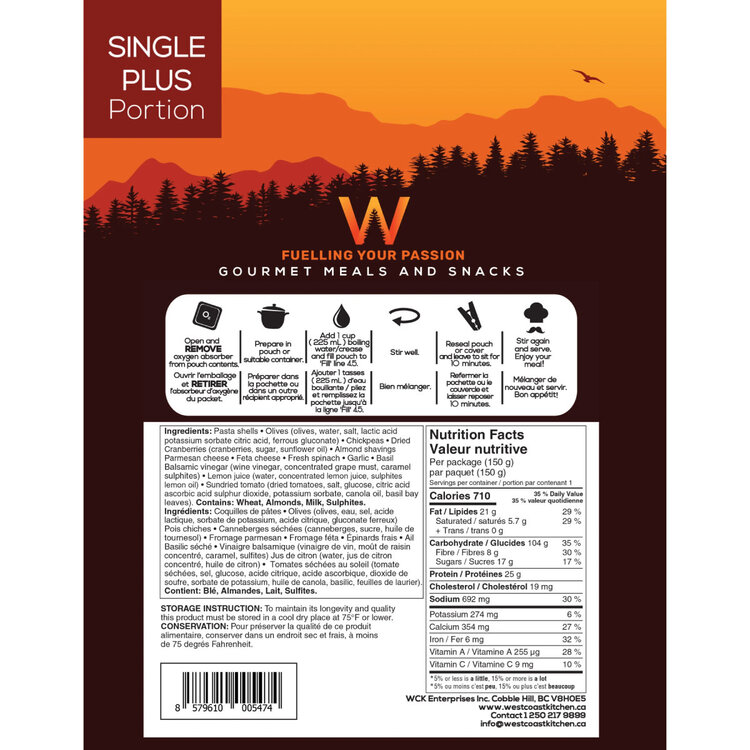 Ingredients: Pasta shells, olive pesto (olives, sundried tomato, garlic, olive oil, dried basil, lemon juice) chickpeas, dried cranberries, almond shavings, parmesan cheese, feta cheese, fresh spinach, balsamic vinegar.