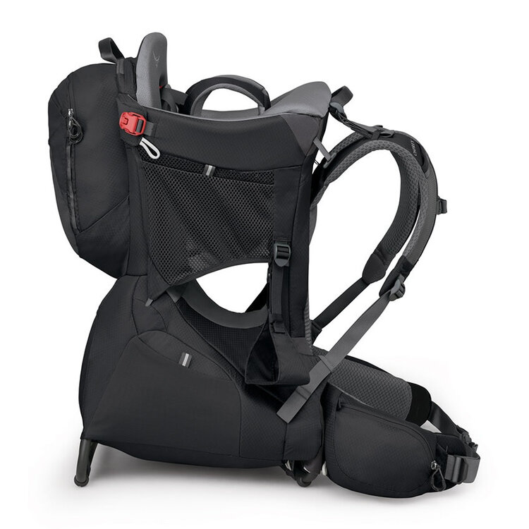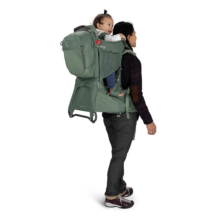 - Suspension: Full wrap aluminum tubing frame provides lightweight but stable heavy load carry Collapsible foot bar provides greater maneuverability while the child carrier is on Patented locking hinges and rotating side arms allow the frame to fold down for travel and storage