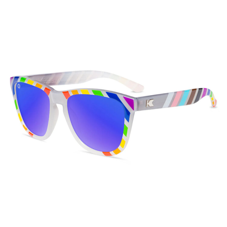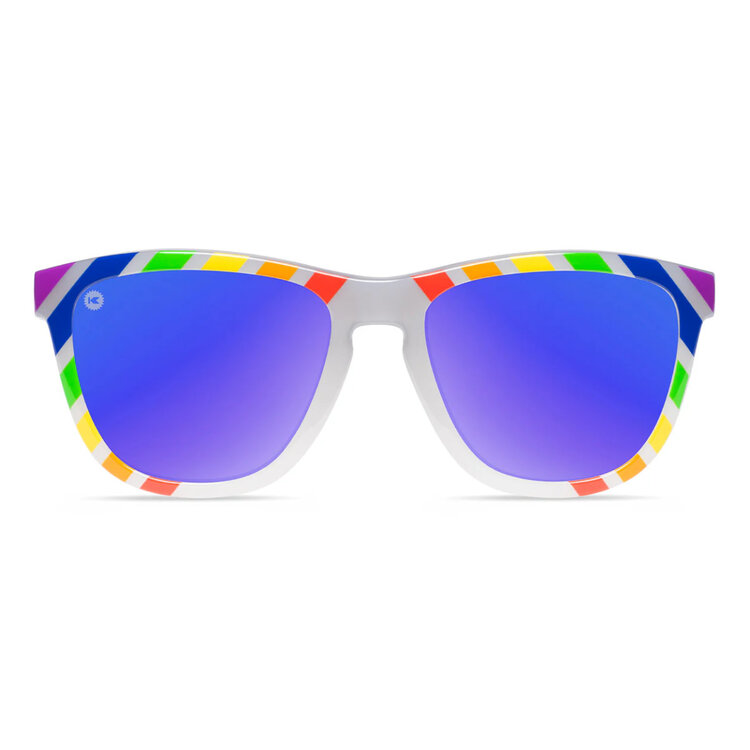 Say it loud and say it proud with Knockaround Pride Premiums. These sunglasses are covered in the colours of the rainbow set on a dark gray backdrop and are enhanced by deep blue moonshine lenses that come with built-in UV400 protection. Premiums frames are universally flattering, with a more accommodating fit than their Classics predecessors. Put your best face forward and show your pride year-round with the Pride Premiums.