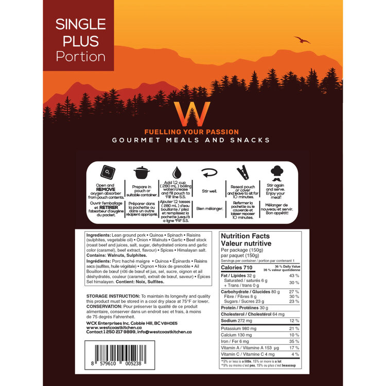 Ingredients: Lean ground pork, quinoa, spinach, walnuts, raisins (sulphites), onion, garlic, sunflower oil, vegetable stock (gluten free), paprika, oregano, fennel seed, black pepper, Himalayan salt, chili powder.