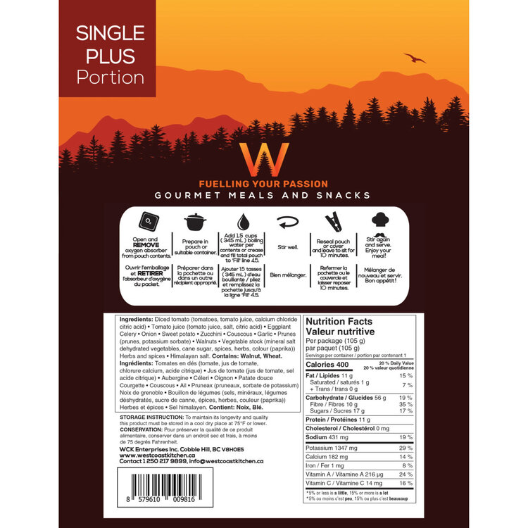 Ingredients: Diced tomato, tomato juice, eggplant, onion, sweet potato, couscous, garlic, prunes, walnuts, vegetable stock, herbs, spices seasoning.