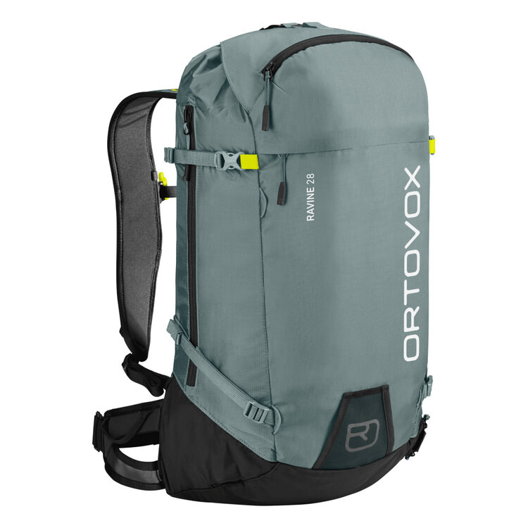 With the aid of a quick-attach parallel ski fastener with carabiner, even wide freeride skis can be attached to the backpack in one easy movement if you need to carry them for short passages. Crampons and ice crampons can be stored in the handy extra compartment at the base, so they are always close to hand without you having to take the backpack off. The separate safety compartment provides quick access to all items of emergency equipment and a light ice axe, while all items in the main compartment can be accessed either from the top or the side. Furthermore, the RAVINE 28 scores highly with the usual attachment options for skis, poles, rope, helmet and ice screws, and includes a map compartment and hydration system compatibility.