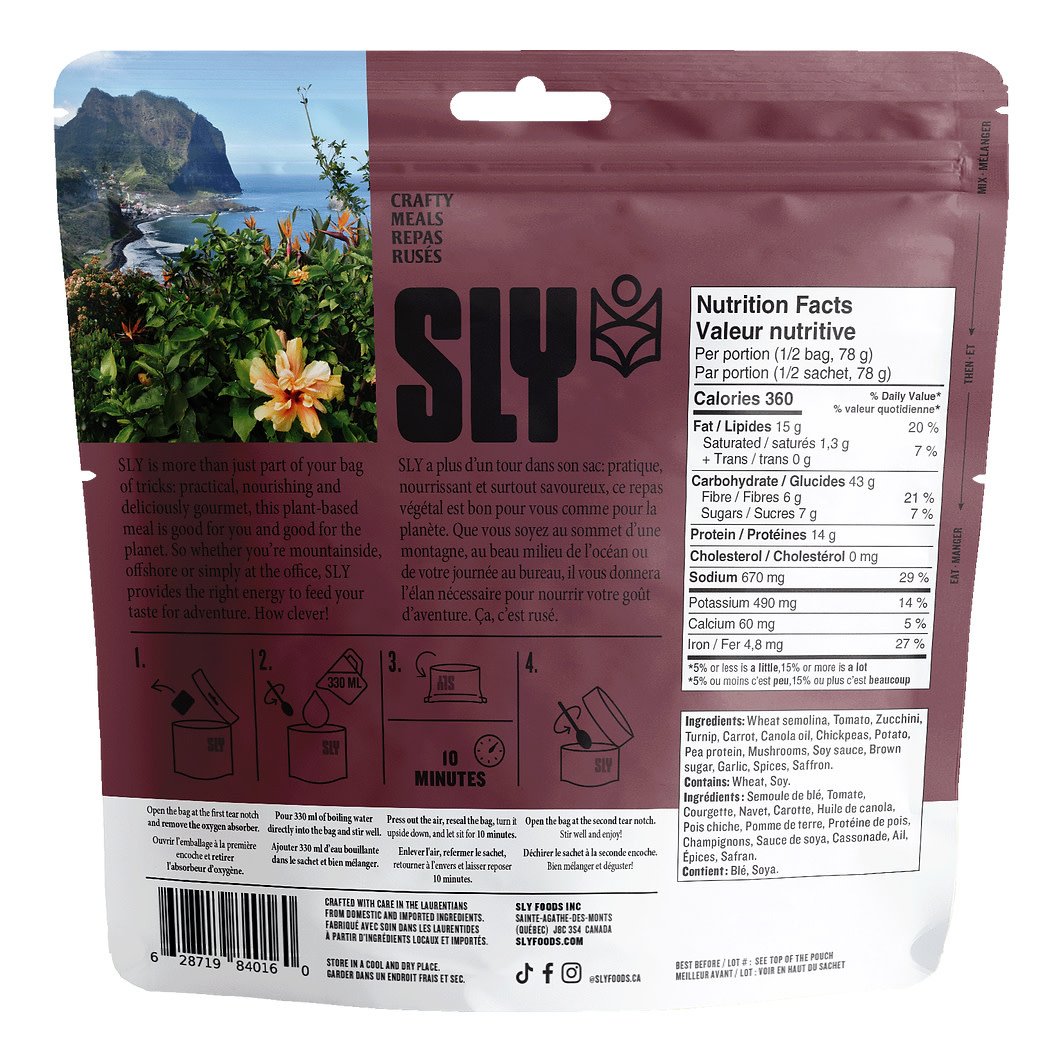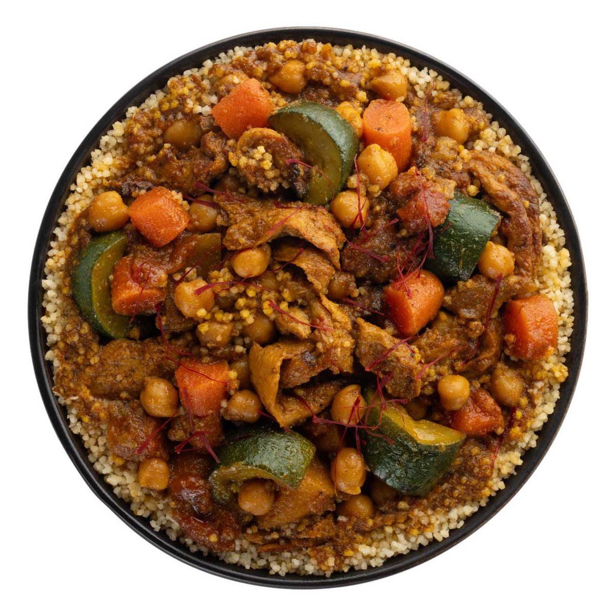 Wheat semolina, Tomato, Zucchini, Turnip, Carrot, Canola oil, Chickpeas, Potato, Pea protein, Mushrooms, Soy sauce, Brown sugar, Garlic, Spices, Saffron.