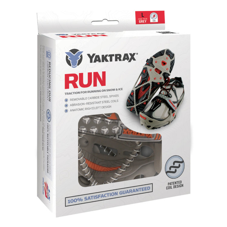 The Yaktrax® Run is the only traction device anatomically designed to meet the needs of runners braving the winter elements. Run naturally on packed snow and ice with the Yaktrax Run's combination of removable spikes and steel coils, providing 360° of unbeatable traction. Continue your training during the winter with the same stability you are accustomed to on dry surfaces. The Yaktrax Run can be worn in temperatures as low as ‑41° Fahrenheit.