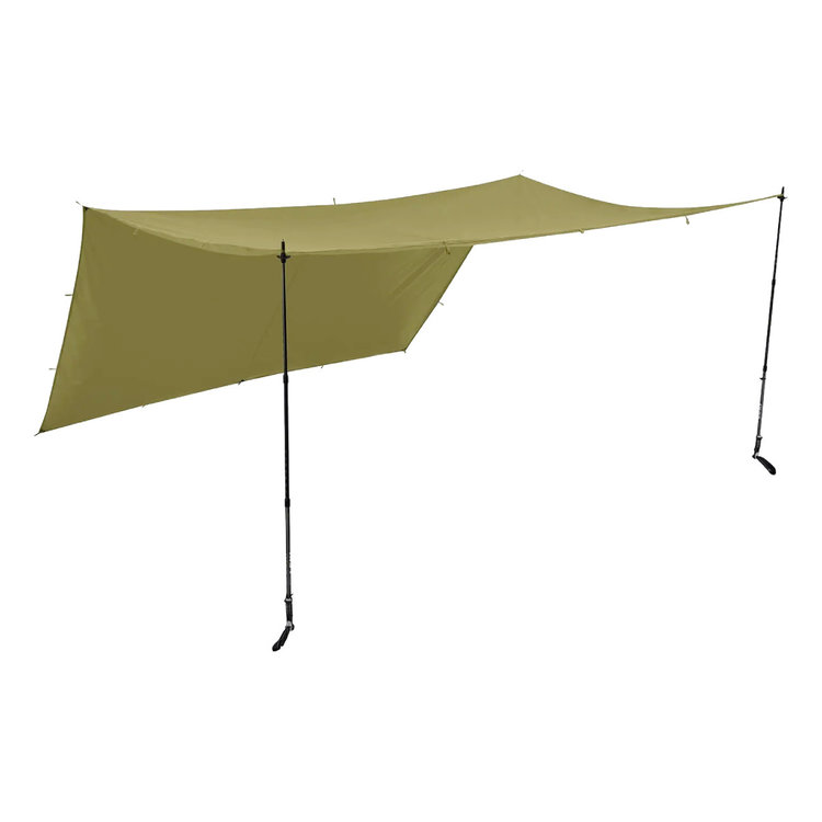 The 3m x 3.66m, large rectangular tarp is made from tough, siliconised 30D Cordura with a PU coating. Ultralight and waterproof, it’s incredibly strong and resilient. The 20 guy points are reinforced for strength and offer a variety of different setup options with one central lifter point.