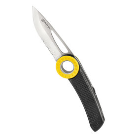 The SPATHA clippable knife is designed to accompany the climber on every outing. The profile of the blade allows easy cutting of ropes and cordage. It has a carabiner hole for attaching the knife to the harness. It is easy to manipulate with its textured wheel, even when wearing gloves, and can be locked in the open position.