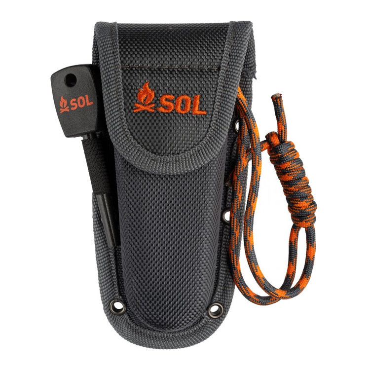 The SOL Stoke Folding Knife is three tools in one. The high-grade, satin-finished 420 stainless steel 3.25-inch blade is serrated at the base to use as a rope cutter. Fold into the handle with the secure liner lock. Strike the blade on the full flint fire starter to light a piece of the tinder cord lanyard’s waxed cotton core. The PP/TPR handle construction provides a non-slip, ergonomic grip that is comfortable to use. Carry the knife and fire-starting essentials in the sturdy riveted holster on your pack or attach to a belt.