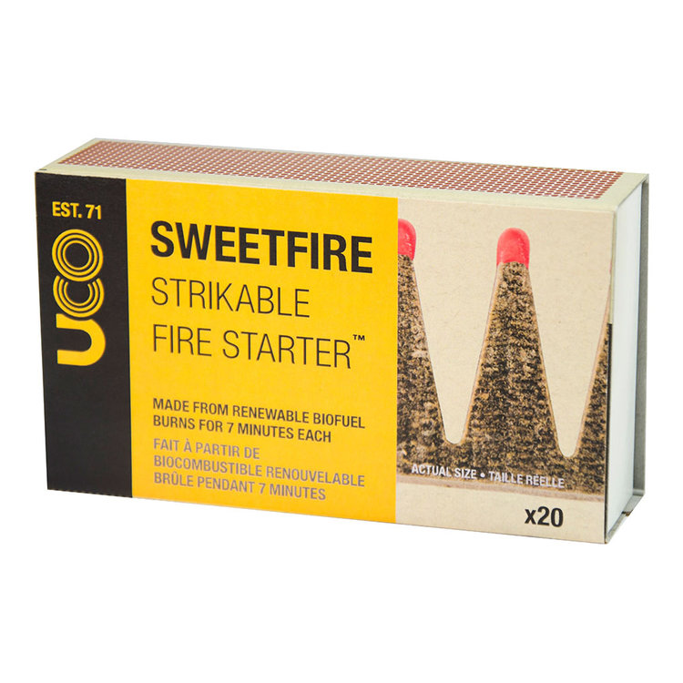 The Sweetfire Strikeable Fire Starter is not only sweet for your gear collection, it's sweet for the planet. Made from a sugarcane by-product called bagasse, this key ingredient is already used around the world as a renewable biofuel. Each of these match points (there are 20 per box) is infused with vegetable wax to allow for up to 7 minutes of burn time per each point. There's also no need to bring matches to light the Sweetfire as each match point has a strikeable tip that can conveniently be used with the striker on the box.