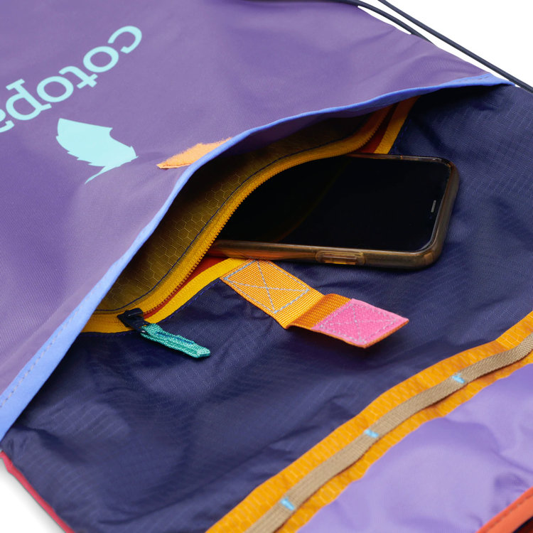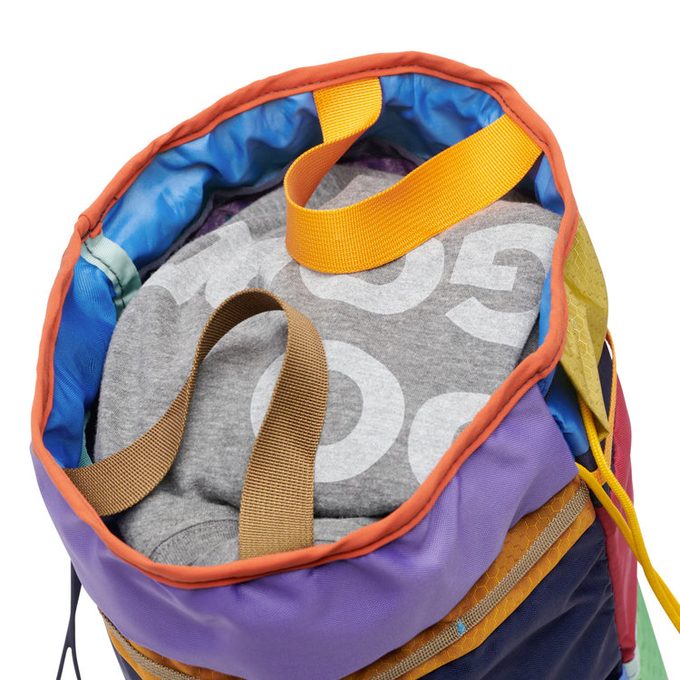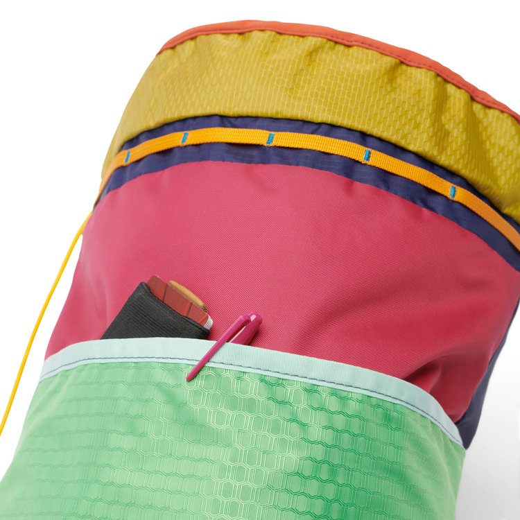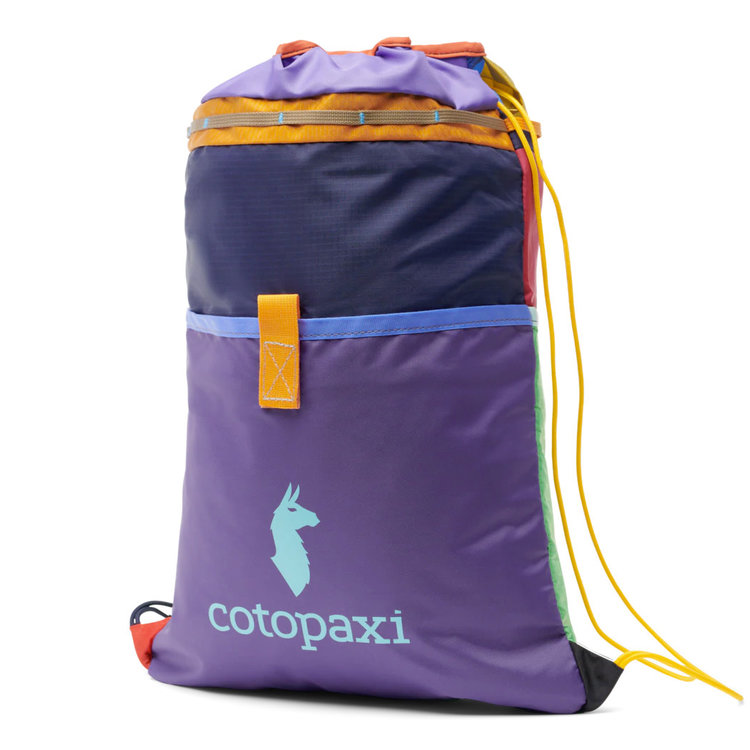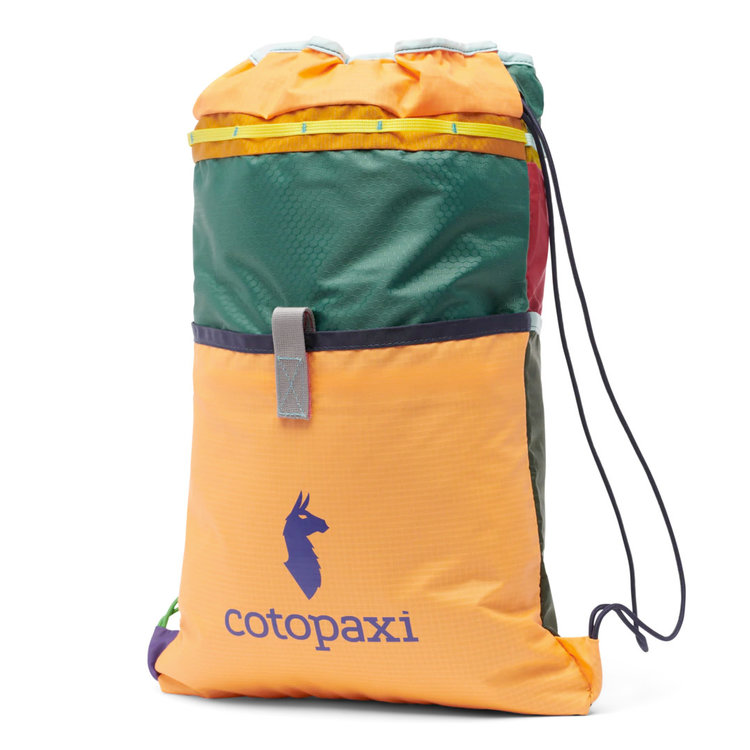 The ultimate in minimal functionality, Tago is Cotopaxi's souped-up version of the classic drawstring. It features a back accessory pocket, top carry handles, a front accessory pocket, and a front daisy chain for tacking on extra belongings.